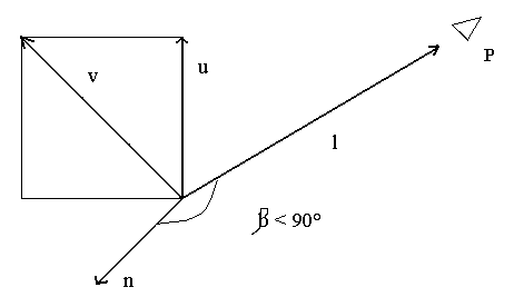 A verificação de visibilidade é então realizada mediante cálculo do ângulo (β) entre o vetor normal (n) de cada uma das faces do objeto em relação ao vetor da linha de visibilidade (l), que é o vetor que se encontra sobre a reta suporte desde o olho do observador até o ponto de encontro de dois vetores (u e v) localizados sobre a face em estudo. Vetor normal n é aquele perpendicular a face em estudo, calculado através do produto vetorial (u x v) de dois vetores contidos na face do objeto.
