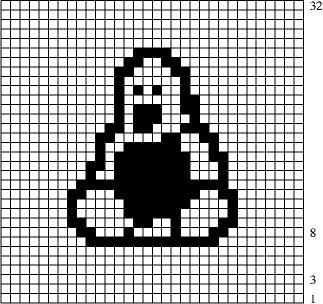 Define o vetor tux[], do tipo GLubyte, para representar o padrão de preenchimento de polígonos utilizado neste exemplo. Existem dois métodos principais para preencher regiões utilizando padrões. O mais comum utiliza texturas, mas não será abordado nesta lição. O outro método consiste em definir um mapa de bits monocromático de 32x32 pixels, representando a máscara para o padrão que se deseja desenhar. O padrão utilizado neste exemplo é mostrado na Figura 3-2. A máscara de desenho (vetor tux[]) é formada por um conjunto de números representados na forma hexadecimal. Para construir este vetor, toma-se cada linha do mapa de bits de baixo para cima. Cada 8 pixels de uma linha da figura equivalem aos bits componentes de um elemento do vetor. Os bits mais significativos ficam à esquerda e os menos significativos à direita. Seguindo esta receita, então a linha 8 da Figura 3-2, representada pela seqüência de bits 00000000110001000010001100000000, equivalerá à seqüência "0x0, 0xc4, 0x23, 0x0" do array tux[].