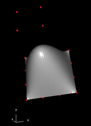 O propósito desta lição é mostrar como gerar no espaço as superfícies paramétricas de Bézier e NURBS utilizando OpenGL. De modo semelhante às curvas descritas no Capítulo 7, a forma destas superfícies é controlada pelo posicionamento de vértices, desta vez componentes de um malha característica. Com a resolução dos exercícios propostos no final da lição, o aluno poderá notar a utilidade das superfícies apresentadas, associando-as a uma situação prática, através da modelagem interativa de uma superfície. Será mostrado também como introduzir iluminação na cena, de modo a tornar a apresentação da superfície mais realística. A superfície gerada pelo programa utilizado nesta lição é mostrado na Figura 8-1. O programa usado para modelar as splines é mostrado no Exemplo 8-1. As teclas b e n definem o tipo de curva que será desenhada: Bézier ou NURBS, respectivamente. As teclas x e X, rotacionam a superfície em torno do eixo x. As teclas y e Y, rotacionam a superfície em torno do eixo y. As teclas z e Z, rotacionam a superfície em torno do eixo z. Exemplo 8-1. programa splines3d.c