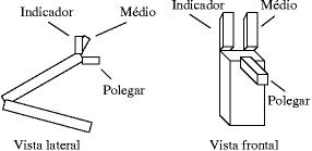 sendo um indicador, um médio e um polegar, como mostra a Figura 4-3. O usuário deverá poder rotacionar o dedo indicador com as teclas i e I, nos sentidos horário e anti-horário. Da mesma forma, as teclas p P deverão rotacionar o polegar, e teclas m M, o dedo médio do robô.